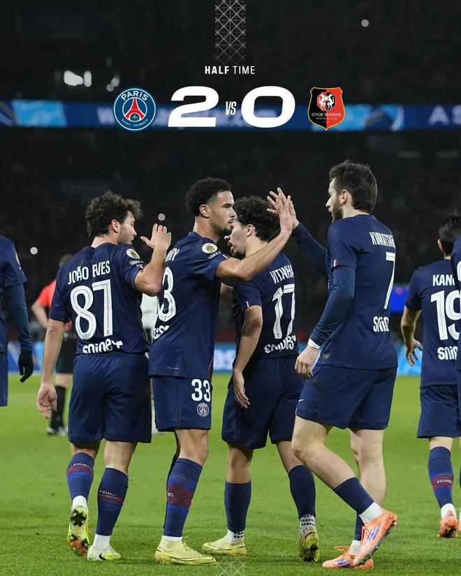 上半场比赛结束,我们暂时以2-0领先雷恩。
